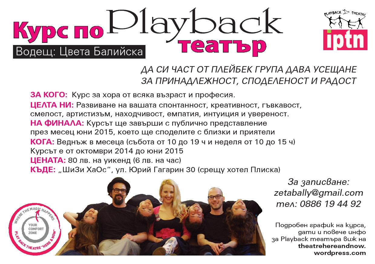 Playback театърът е импровизационен театър, чийто сценарий са историите на хората от публиката. Все още не е популярен в България, но славата му все повече се разраства с представленията на Playbаck театър „Тук и сега”(основан януари 2013г. от Цвета Балийска) Повече информация на theatrehereandnow.wordpress.com